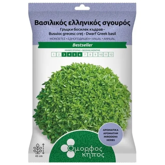 - Lockig Basilikafrön, klassisk grekisk sort med små blad, särskilt aromatiska.