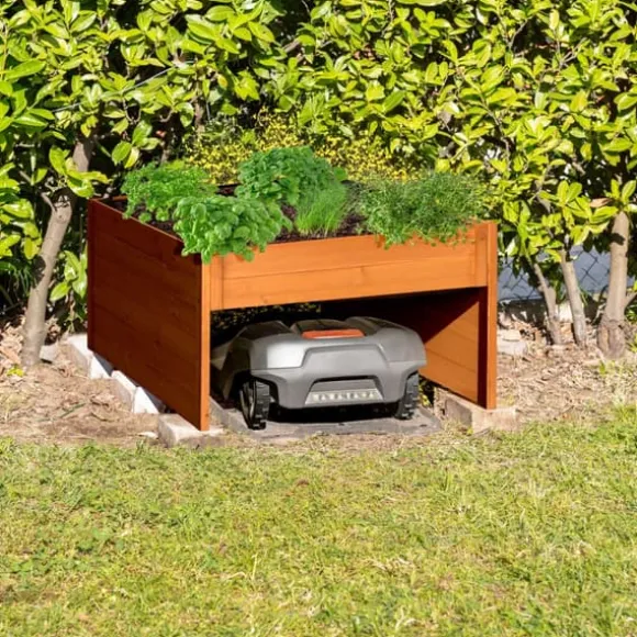 Detta garage för robotgräsklippare ger ett idealiskt skydd för din robotgräsklippare och laddstation mot regn, sol, vind och smuts, vilket hjälper till att förebygga för tidigt slitage. Dess dekorativa design med en upphöjd planteringslåda gör att det smälter harmoniskt in i din trädgårdsmiljö.