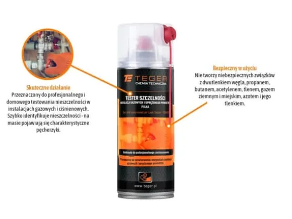 Gas- och tryckluftssystem läckagetestare – Skum, 400 ml, TEGER. Professionell serviceagent för exakt lokalisering av läckor i gassystem (LPG, CNG, propan, butan, etc.) och trycksatta tryckluftssystem. Produkten innehåller en speciell substans som täcker systemkomponenter med en enhetlig massa. Vid läckage uppstår karakteristiska bubblor på massan. Säker för de flesta material, inklusive metaller, plaster och gummi. Bildar inte farliga föreningar med koldioxid, propan, butan, acetylen, syre, natur- och stadsgas, kväve och kväveoxid. Ej korrosiv och lätt att använda – applicera helt enkelt skummet på anslutningarna som testas och observera reaktionen. Användningsanvisning: Skaka ordentligt före användning, spraya sedan den testade systemkomponenten med hjälp av det medföljande röret från ett avstånd av 3-4 cm. Om systemet läcker kommer karakteristiska bubblor att dyka upp. Produkten kräver ingen förrengöring. Det kräver inte sköljning från den testade ytan. Det reagerar inte med metall. Produkten kan användas i vilken position som helst. Avfallshantering: Kassera behållaren i lämpligt märkta behållare i enlighet med nationella bestämmelser.
