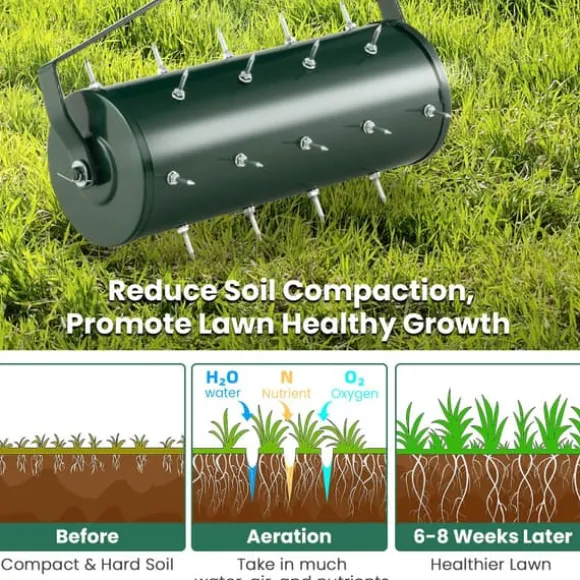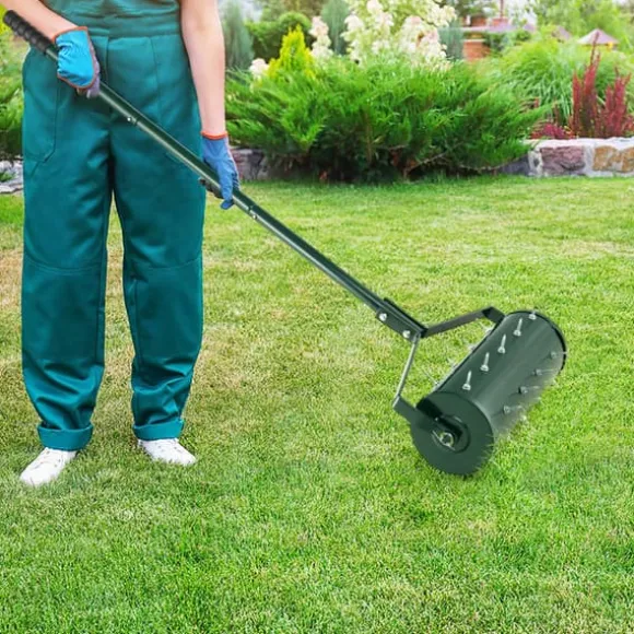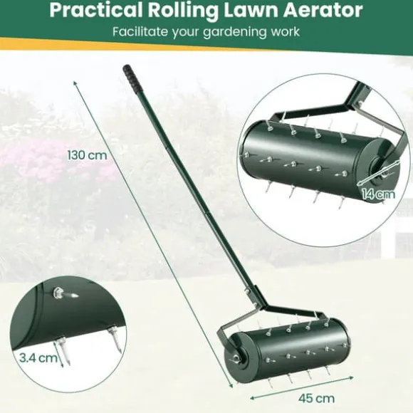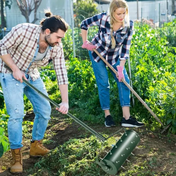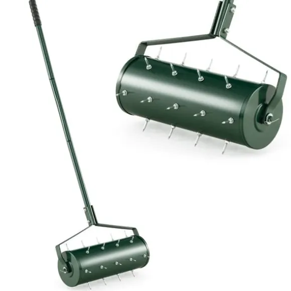 Den 18/21 tum manuella gräsmatteluftraren med avtagbart handtag och tinnar är ett praktiskt trädgårdsverktyg som är utformat för att effektivt lossa jorden och främja växttillväxten. Den har en bekväm, halkfri handtag och rostfria tinnar, vilket gör den lämplig för olika typer av jord och säkerställer lång hållbarhet.