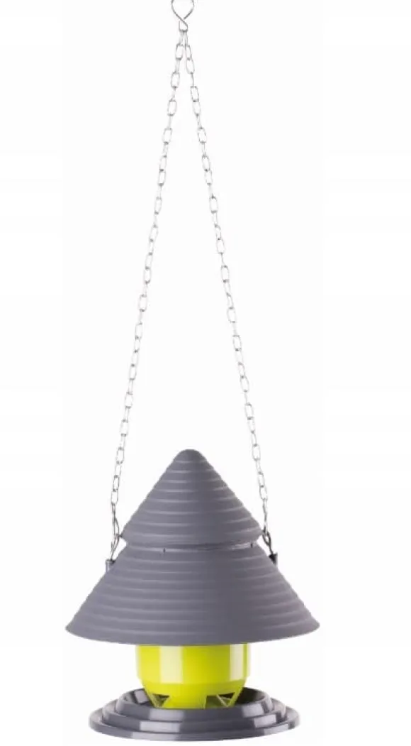 Fågelmatare med fröbehållare. Det runda taket skyddar maten från nederbörd. Den kan hängas i ett träd. Designen gör det också möjligt att placera den på en påle.