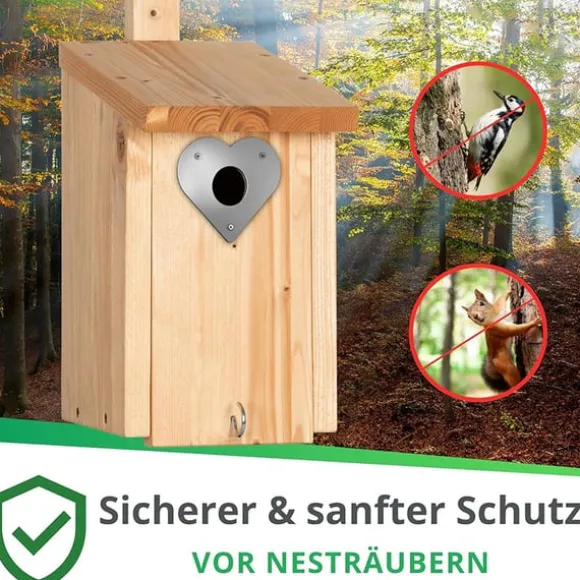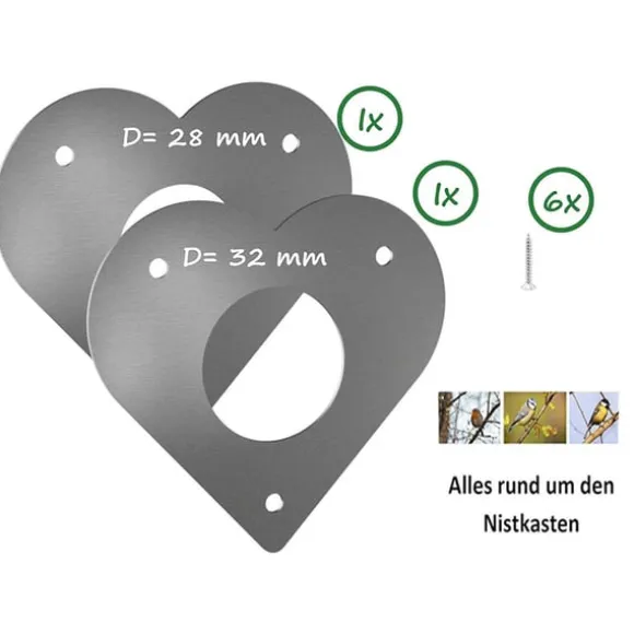 Universell fågelholkskompatibilitet: Denna hjärtformade skyddsplatta är utformad för att passa ett brett utbud av fågelholksingångshål med sina två storleksalternativ: 28 mm och 32 mm. Den ger en säker barriär mot rovdjur samtidigt som den bibehåller tillgängligheten för fåglar.