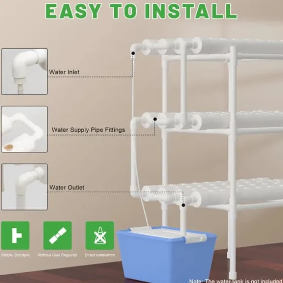 Hydroponiskt odlingskit med 3 nivåer och 108 odlingsplatserDetta vertikala, jordfria system ger hög skörd på liten yta. Med 12 PVC-rör, S-format flöde och intern recirkulation levereras syresatt näring direkt till rötterna för krispiga, smakrika bladgrönsaker – hemma, på balkongen eller i växthus.