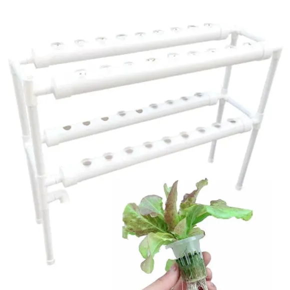 Tvålagers hydroponiskt odlingsställ med 36 hål – en smidig, stapelbar lösning för färska örter och bladgrönt på balkongen. Systemet använder S‑flödesprincipen för jämn vattentillförsel, har automatisk bevattning och monteras snabbt med plug‑in‑kopplingar utan lim.