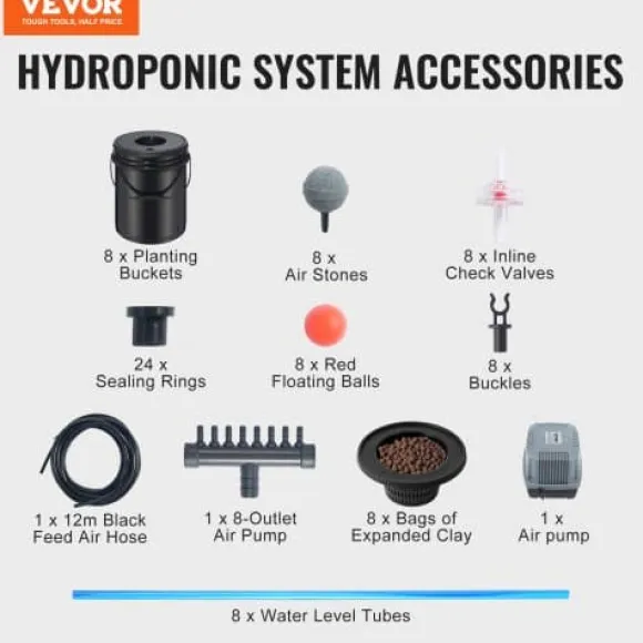 Detta hydroponiska odlingssystem är utformat för effektiv och jordfri odling av grönsaker, frukter och blommor året runt. Med slitstarka, korrosionssäkra odlingshinkar och en kraftfull luftpump med luftstenar ger det optimal syresättning för hälsosam växttillväxt. Komplett kit som är lätt att montera och lämpligt för användning i olika inomhus- och utomhusmiljöer.