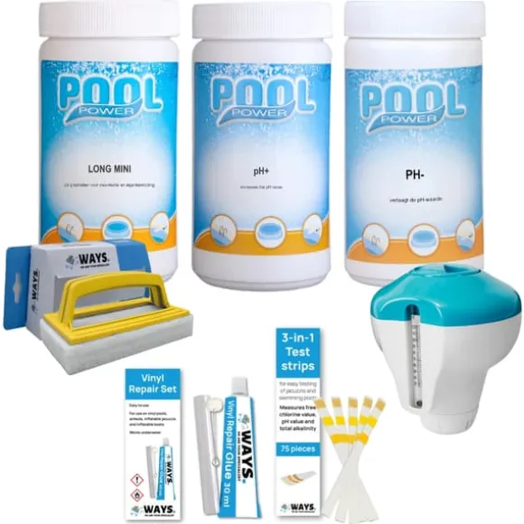 Inklusive underhållspaket för poolenWAYS poolunderhållspaket har tagits fram speciellt för att underhålla din pool på rätt sätt. Detta paket innehåller allt du behöver för att hålla ditt vatten i toppskick hela sommaren. Dessutom hittar du all nödvändig information för att använda underhållsartiklarna i den medföljande ’WAYS Swimming Pool Brochure’.