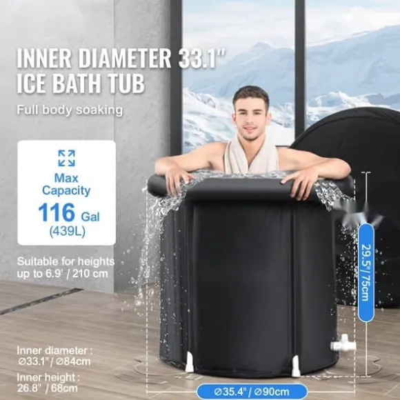 Vårt bärbara kallbadkar är designat för att rymma de flesta kroppstyper, så att du kan sitta upprätt. Med måtten 35,4″x29,5″ / 900×750 mm och en kapacitet på 97,7 Gal / 370 L, är det rekommenderas för personer under 2,1 m långa. Upplev rymligheten och lyxen av en isvattensjö och pool när som helst.