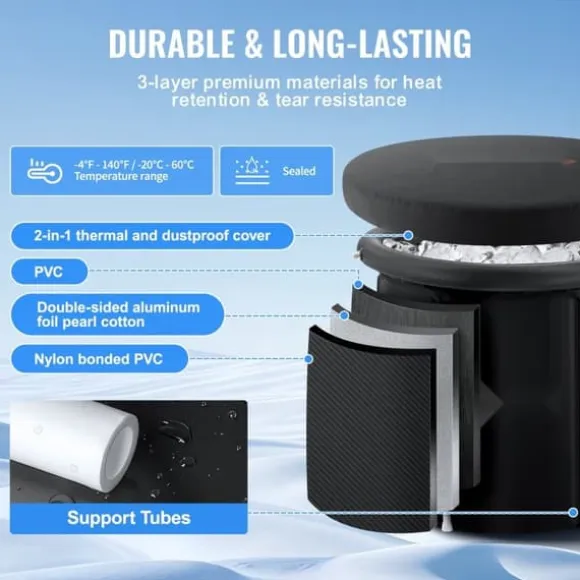 Isbadkarets kropp och lock är vattentäta och rivtåliga, med ett tyg i flera lager med ett inre PVC-skikt, dubbelsidigt mellanskikt av aluminiumfolie i pärlbomull och vatten- avvisande nylonbunden PVC yttre skikt. Både badkarstommen och dammskyddet med pärlbomullsskikt ger utmärkt termisk effekt. Det användbara vattentemperaturområdet är -4°F-140°F / -20°C-60°C. Badkaret stabiliseras av stödrör med en diameter på 0,8″ / 20 mm.