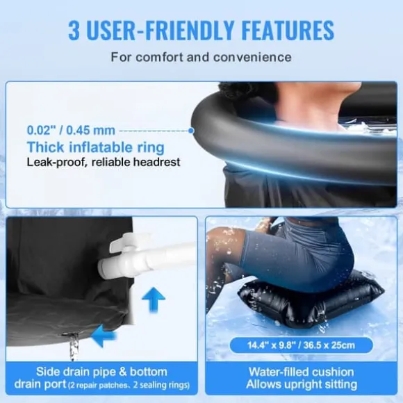 Du kan slutföra installationen ensam inom några minuter, vilket ger en avkopplande isbadupplevelse. Under användning erbjuder den 0,02″ / 0,45 mm uppblåsbara ringen ett bekvämt nackstöd, och den vattenfyllda kudden kan användas som ett säte. När den inte används, öppna helt enkelt bottenavloppet eller sidoavloppsröret för att tömma den kalla avsvalkningspoolen, utan att kräva något komplicerat underhåll Vi tillhandahåller även reparationsplåster för eventuella punkteringar orsakade av vassa stenar, vilket förlänger badkarets livslängd.