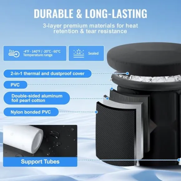 Isbadkarets kropp och lock är vattentäta och rivtåliga, med ett tyg i flera lager med ett inre PVC-skikt, dubbelsidigt mellanskikt av aluminiumfolie i pärlbomull och vattenavvisande nylonbundet PVC yttre skikt. Både badkarstommen och dammskyddet med pärlbomullsskikt ger utmärkt termisk effekt. Det användbara vattentemperaturområdet är -4°F-140°F / -20°C-60°C. Badkaret stabiliseras av stödrör med en diameter på 0,8″ / 20 mm.