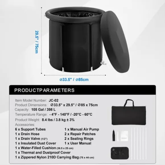 Du kan slutföra installationen ensam inom några minuter, vilket ger en avkopplande isbadupplevelse. Under användning erbjuder den 0,02″ / 0,45 mm uppblåsbara ringen ett bekvämt nackstöd, och den vattenfyllda kudden kan användas som ett säte. När den inte används, öppna helt enkelt bottenavloppet eller sidoavloppsröret för att tömma den kalla avsvalkningspoolen, utan att kräva något komplicerat underhåll. Vi tillhandahåller även reparationsplåster för eventuella punkteringar orsakade av vassa stenar, vilket förlänger badkarets livslängd.