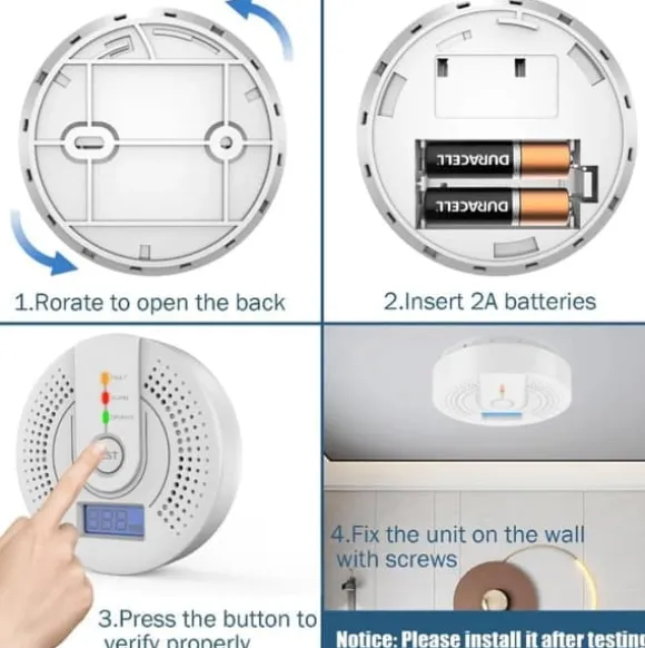 Enkel installation och batteridrift: CO-detektorn är lätt att installera. Skruva fast monteringsplattan på valfri vägg eller tak, sätt i batterierna (ingår ej) och anslut detektorn. En batterivarningsfunktion påminner dig när batterinivån är låg, vilket gör det enkelt att byta batteri och säkerställer att din detektor alltid fungerar när du behöver den.