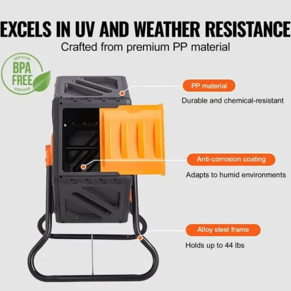 Vår utomhus komposttunna är tillverkad av högkvalitativt PP-material och stöds av stabila metallkomponenter. Den har en robust kapacitet på 20 kg (44,1 lbs). Den är BPA-fri, UV- och väderbeständig och tål direkt solljus, tyfoner, regn, snö och mycket mer.
