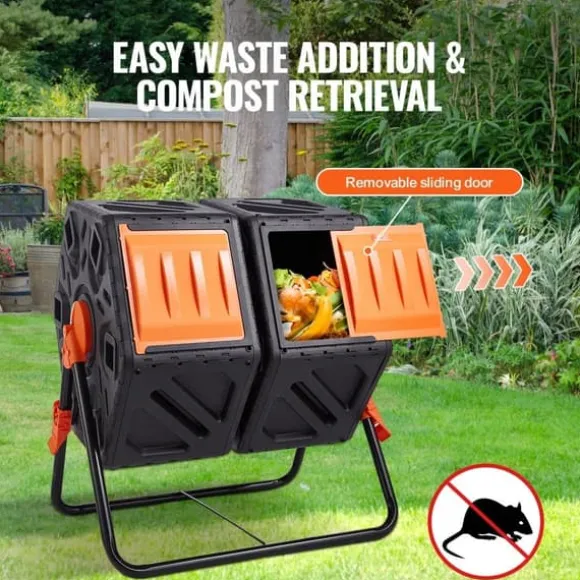 Bekväm åtkomst: Denna tvåkammars kompostbehållare har en avtagbar skjutdörr med stor öppning, vilket gör det enkelt att lägga till avfall eller ta ut kompost. Kompostbehållaren har en säker tätning som håller möss, insekter och andra skadedjur borta, vilket garanterar en säker och effektiv komposteringsprocess.