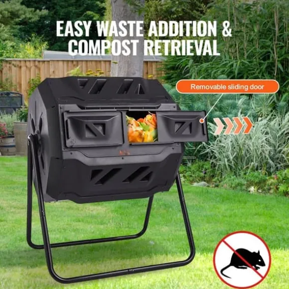 Bekväm åtkomst: Denna tvåkammars kompostbehållare har en avtagbar skjutdörr med en stor öppning, vilket gör det enkelt att lägga till avfall eller ta bort kompost. Kompostbehållaren har en säker tätning som håller möss, insekter och andra skadedjur borta, vilket säkerställer en säker och effektiv komposteringsprocess.