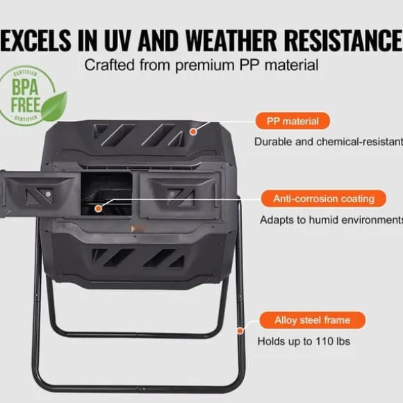 Hållbarhet: Vår utomhuskomposttunna är tillverkad av högkvalitativt PP-material och stöds av stabila metallkomponenter. Den har en robust kapacitet på 50 kg (110 lbs). Den är BPA-fri, UV- och väderbeständig och motstår direkt solljus, tyfoner, regn, snö och mycket mer.