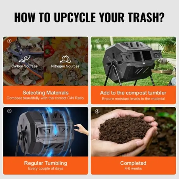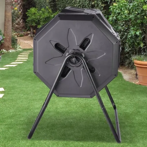 Enkel omrörning: Ingen mer mödosam omrörning för hand. Den innovativa 360°-trommeldesignen på vår komposter säkerställer en grundlig blandning, snabbare nedbrytning och bättre kompostkvalitet. Vrid helt enkelt på kompostern några gånger i veckan, och på bara 4-6 veckor har du färdig kompost.