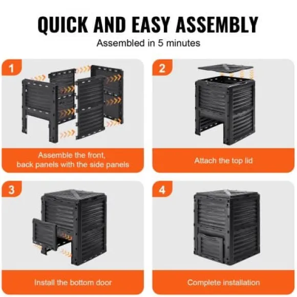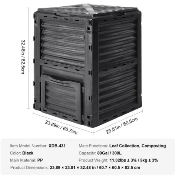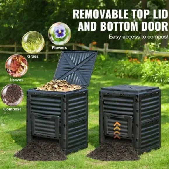Denna stora utomhuskompostbehållare är utformad för effektiv kompostering och har utmärkt ventilation på alla sidor samt ett säkert topplock och en bottenlucka för enkel åtkomst. Den rymliga kapaciteten gör den idealisk för hantering av trädgårdsavfall och matrester, medan det BPA-fria, UV-beständiga materialet säkerställer hållbarhet och säkerhet. Snabb att montera och lättviktig, hjälper den dig att skapa bördig jord snabbare till din trädgård.