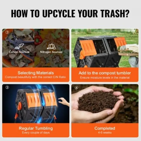 Denna kompostbehållare med dubbla kammare är utformad för effektiv och bekväm kompostering, vilket gör det möjligt att bearbeta ny och mogen kompost samtidigt. Den robusta konstruktionen, väderbeständiga materialen och den användarvänliga tumlingsmekanismen gör den idealisk för trädgårdar, kök och utomhusmiljöer. Den säkra, skadedjurssäkra designen och optimerade luftflödet säkerställer snabb och effektiv nedbrytning.