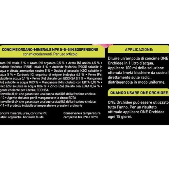 ONE Orchidee är den nya och innovativa lösningen från Valagro som uppfyller alla näringsbehov för orkidéer, stödjer deras återblomning och förlänger deras livslängd. Formuleringen av ONE Orchidee, ett organo-mineralt NPK-gödsel 5-5-5, är berikad med värdefulla mikroelement och exklusiva växtextrakt som gör den effektiv för långvariga, hållbara och frodiga blomningar. Produktens egenskaper: Fullständig formulering för alla orkidéer Stöder återblomning Berikad med värdefulla mikroelement 20 engångsampuller Dosering: Späd en ampull av gödsel ONE Orchidee i 1 L vatten. Applicera 100 ml av den resulterande lösningen (hälften av ett köksglas) direkt på rötterna, fördela det jämnt. Registreringsinformation: Registreringsnamn: ONE Orchidee Produkt att använda med försiktighet och hålla utom räckhåll för barn. För att undvika risker för mänsklig hälsa och miljön, följ bruksanvisningen på förpackningen.