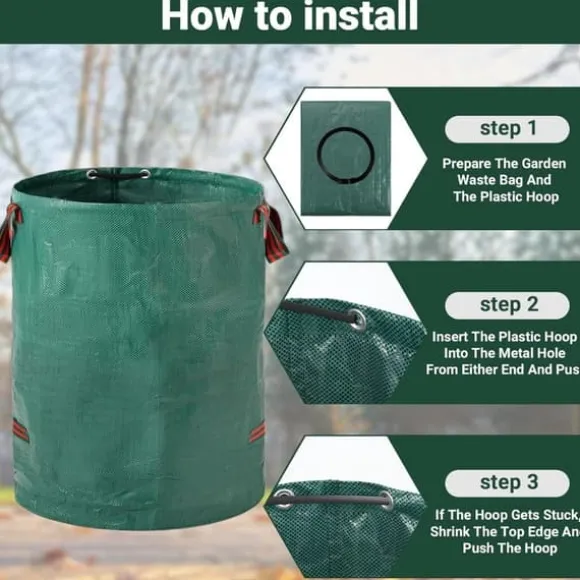 Separat påse – Denna trädgårdsavfallspåse har fyra robusta handtag (2 på toppen, 2 på botten) med dubbelsydda band och förstärkt flexibel båge för att hålla påsen upprätt och öppen för enkel sophämtning. Den är hopfällbar och lätt att förvara när den inte används.