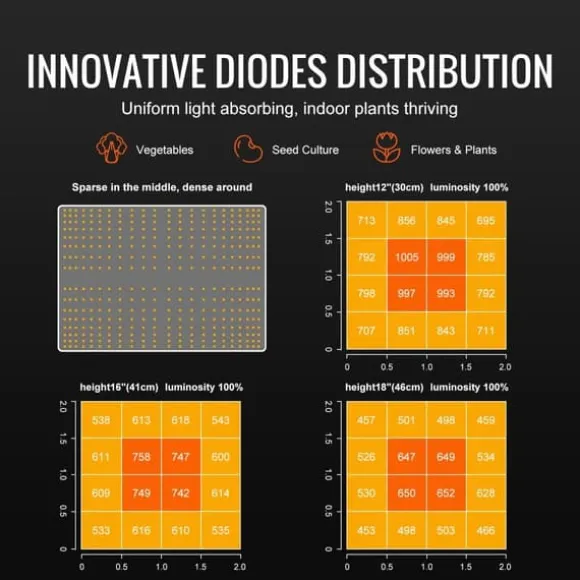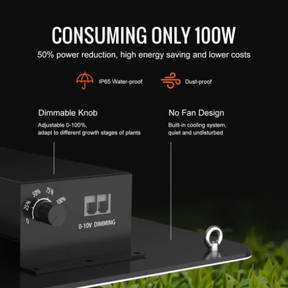 Låg värme och ljudnivå: Denna växtlampa är utrustad med en innovativ kylstruktur, en större kylyta och en fläktlös design. Dina växter kommer att blomstra som aldrig förr! Den är inte bara tyst, utan skyddar också mot överhettning och brännskador. Med en IP65-klassning för vattentålighet och dubbel dammtålighet kan livslängden nå upp till 50 000 timmar.