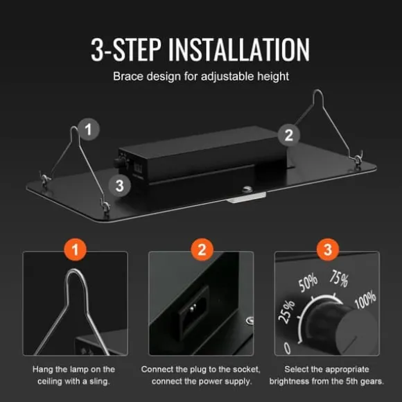 Enkel installation & justering: Vår växtlampa levereras med en hållstång och kan justeras i höjd, vilket gör den stabil och flexibel att installera. Med fem ljusstyrkenivåer kan du fritt justera ljusintensiteten. Multi-ljuskoppling med enhetlig dimning är särskilt fördelaktig för stora inomhusodlingar och kommersiell odling, så att du får kontroll över varje rum.