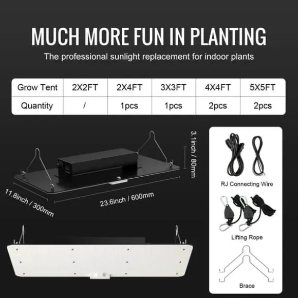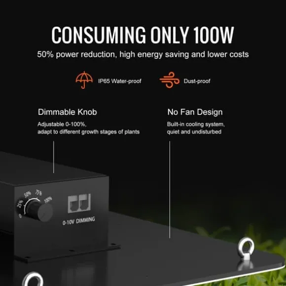 Låg Värme & Lågt Ljud: Vår växtlampa är utrustad med en innovativ kylstruktur, en större kylyta och en fläktlös design. Dina växter kommer att blomstra som aldrig förr! Den är inte bara tyst, utan skyddar också mot överhettning och brännskador. Med en IP65 vattentålig och dubbel dammtät design kan livslängden nå upp till 50 000 timmar.