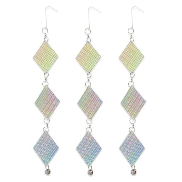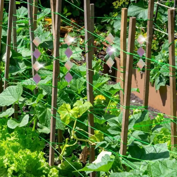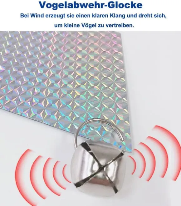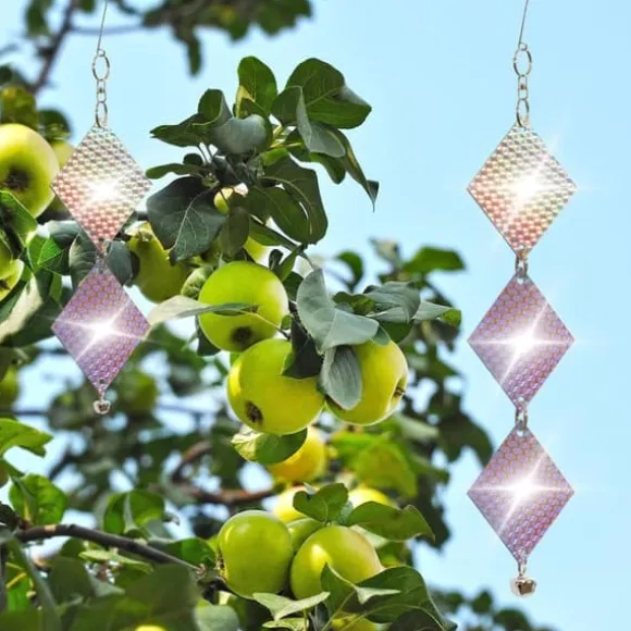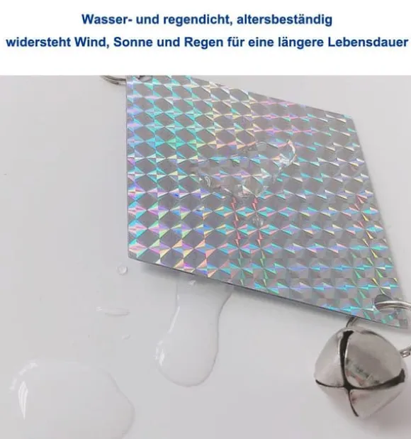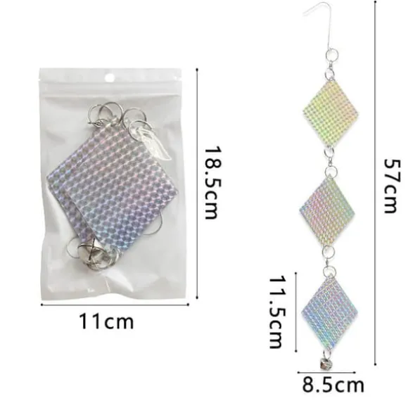Dessa holografiska, diamantformade vindspel reflekterar solljus med en laserliknande effekt, vilket skrämmer bort fåglar som duvor, gäss och hackspettar genom ljus och rörelse.
