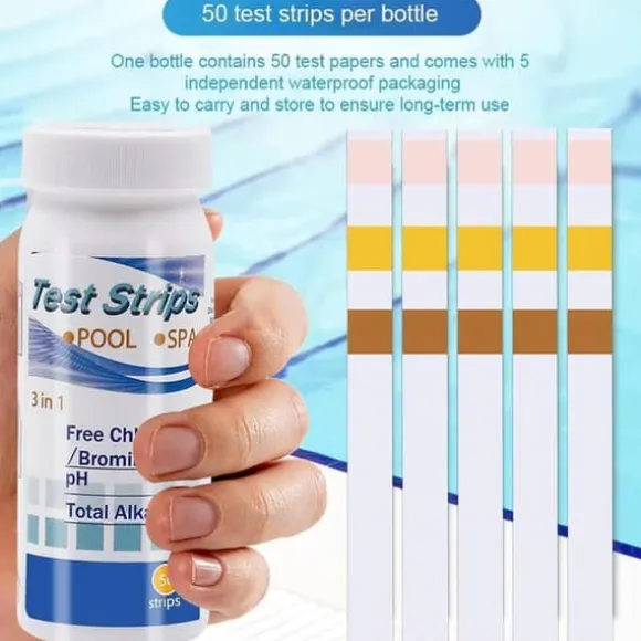 Håll ditt pool- och spavatten rent med detta 50-pack 3-i-1 testremsor! Snabbt, exakt och enkelt att använda för att mäta pH, alkalinitet och fritt klor.