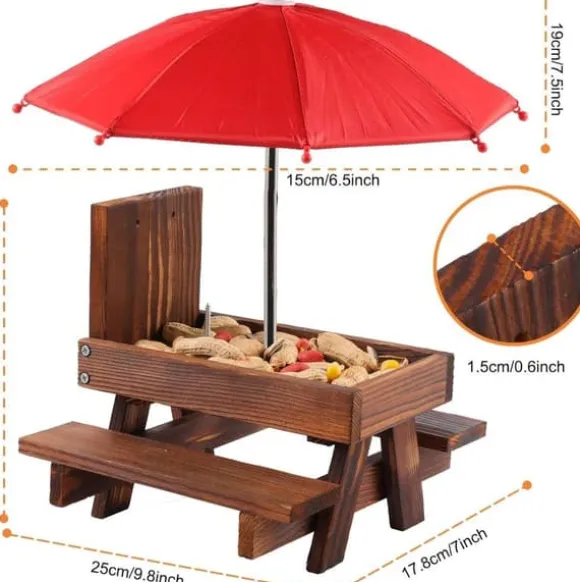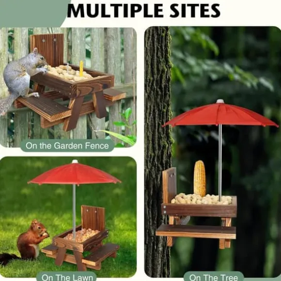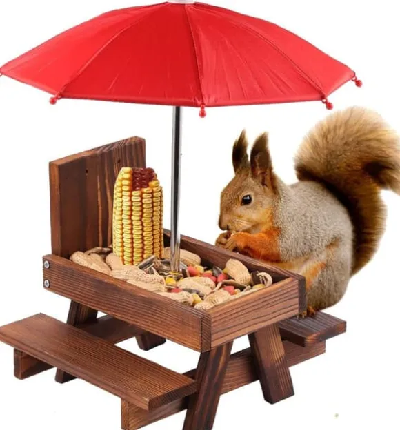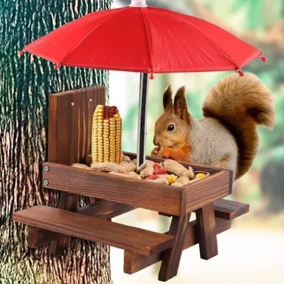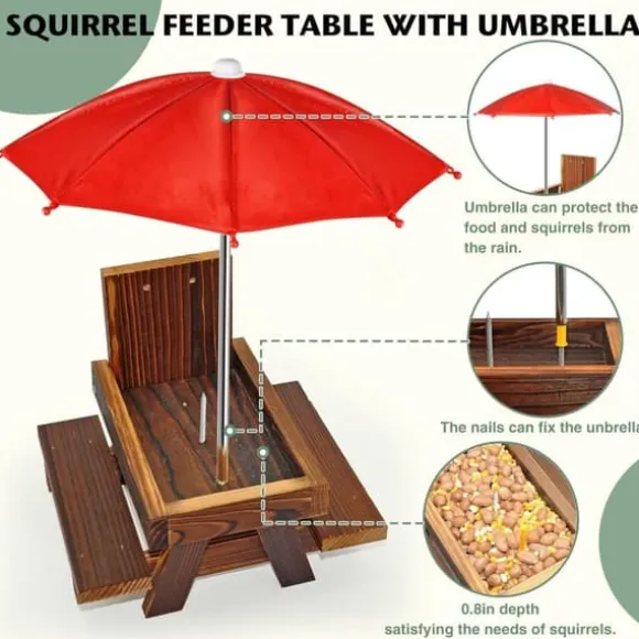 Denna ekorre-matstation är utrustad med ett rött parasoll som inte bara är visuellt tilltalande för ekorrar, utan även erbjuder skugga och skydd mot direkt solljus. Maten håller sig färsk och smakrik samtidigt som ekorrarna kan njuta av sina måltider i en bekväm miljö, vilket ökar interaktionen i trädgården.