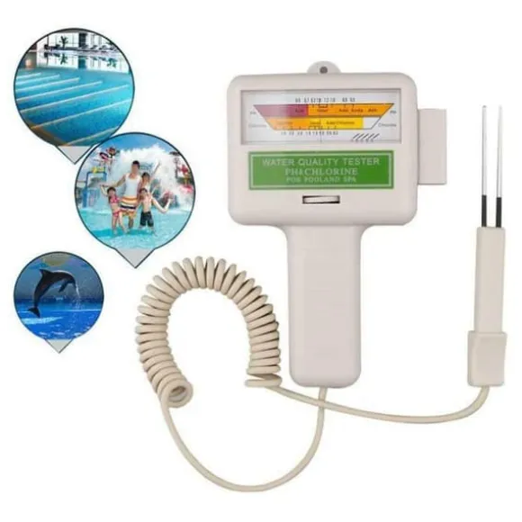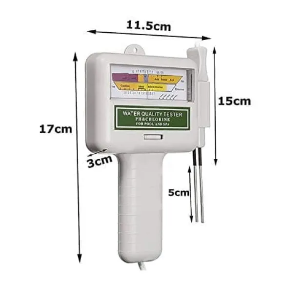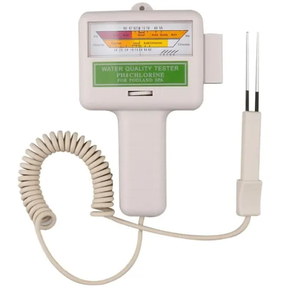 Denna PC-101 testare mäter pH (7.2-7.8) och klor (1.2-1.7 ppm) med stor display för enkel avläsning. Lätt, kompakt med hänghål och hållbar plastskal. Perfekt för pooler, spa och akvarier (endast sötvatten).