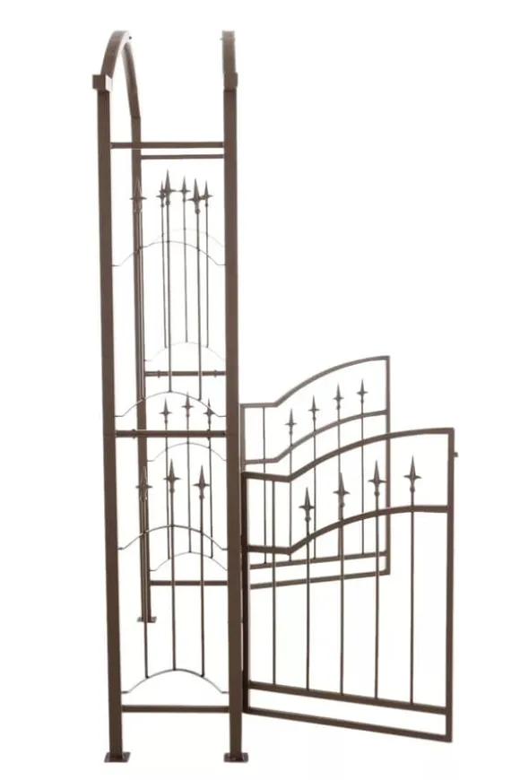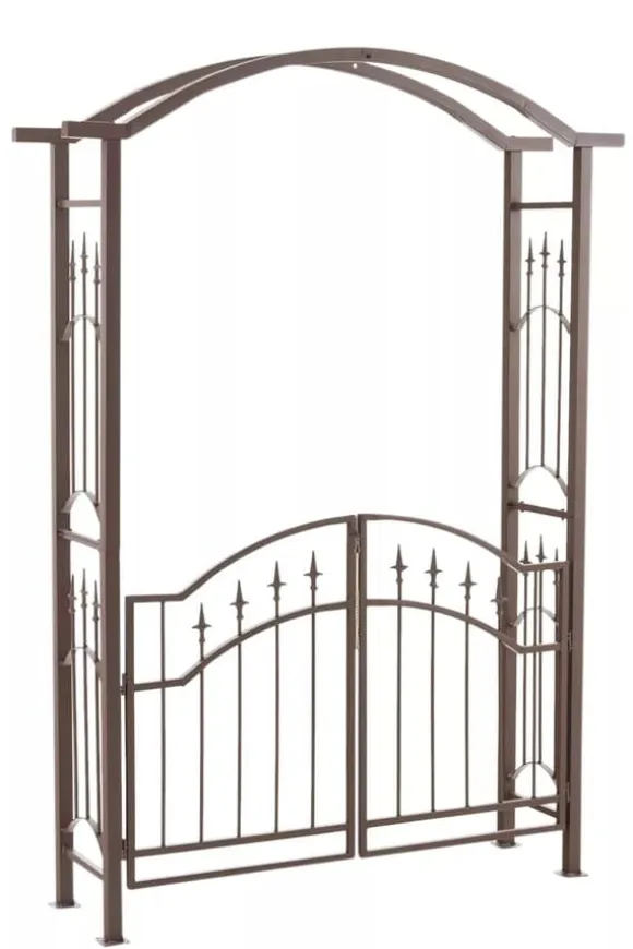 Exclusive iron rose arch with gate. This arch features an elegant design and is the ideal climbing support for all climbing plants, such as roses or ivy. It was handcrafted from iron and is therefore extremely stable. A paint finish makes this rose arch high-quality and extremely durable. This is particularly important, as the arch should not collapse under the weight of the full bloom.