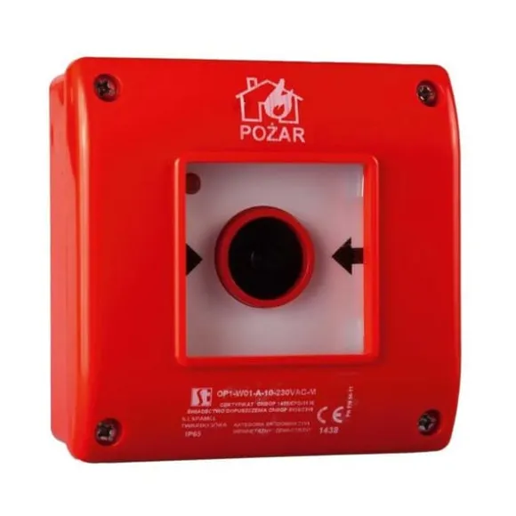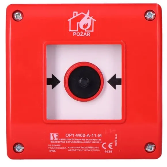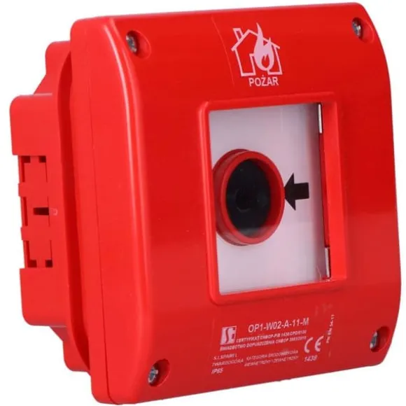 Manuell utlösare OP1 är utformad för användning i offentlig och industriell miljö. Den finns i två versioner: infälld och påbyggd. Varje version erbjuds i två typer: A och B. På OP1 typ A, vid larm, räcker det med att krossa glaset för att frigöra knappen. På OP1 typ B, efter att ha krossat glaset, räcker det med att trycka på den automatiska återställningsknappen. Varje enhet kan rymma tre brytare SP22-10 (normalt öppen) eller SP22-01 (normalt stängd). Dessutom kan varje version utrustas med en integrerad diod som kan kopplas till brytaren eller direkt till larmet i installationen. En signal aktiveras och skickas genom att krossa glaset (typ A) eller genom att krossa glaset och trycka på den automatiska återställningsknappen (typ B). Larmet återställs genom att byta ut den ömtåliga komponenten (glas – beställningskod PPOŻ-5701). Produkten uppfyller standarden PN-EN 54-11. Godkännandecertifikat nr 0654/2009. CE-överensstämmelsecertifikat nr 1438/CPD/0130.