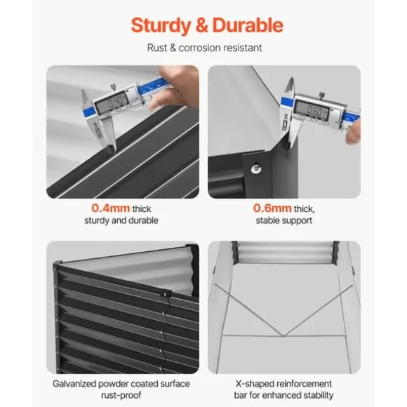 Stark och hållbar konstruktion: Tillverkad med 0,4 mm tjocka metallpaneler och 0,6 mm tjocka hörnpaneler är vår trädgårdsbädd byggd för att hålla. Ytan är belagd med galvaniserat pulver för att motstå rost och korrosion, vilket garanterar lång hållbarhet utomhus. Förstärkningsstängerna ger extra stabilitet och håller sängen på plats även under tuffa väderförhållanden.