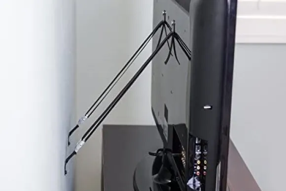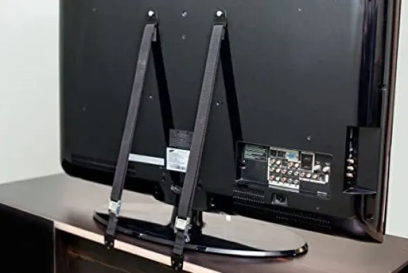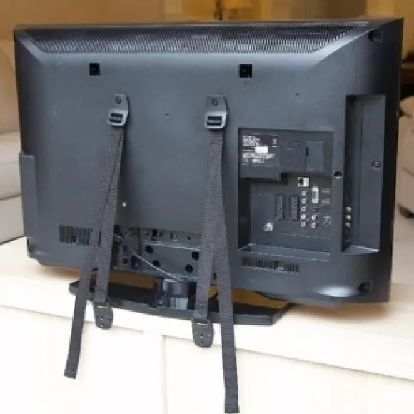 SafetyStrap Alicia från HomeSafety är ett bra sätt att barnsäkra sin TV. Den består av två stycken remmar som skruvas fast i baksidan av TV:n och skruvas sedan in i bakkant på TV-bänken eller i väggen. Dra sedan åt remmarna ordentligt så de sitter stabilt.
