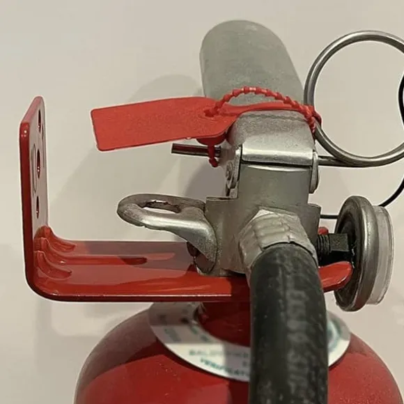 3. Vägghållaren i metall med måtten 4,44*5,08*8,89 cm/1,75*2,0*3,5 tum tar inte upp för mycket plats på väggen och springans storlek är 2,54*4,44 cm/1,0*1,75 tum. Vertikal montering och lätt böjda krokkäftar håller brandsläckaren på plats och förhindrar att den rör sig eller faller. Den röda ytan matchar brandsläckarens färg med en naturlig, mycket fin färg som inte sticker ut.