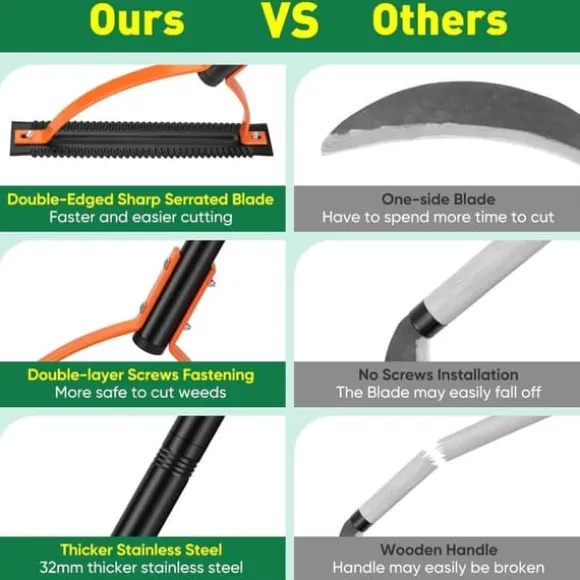 【Dubbeleggad vass tandad klinga】Uppgraderat ogräsverktyg med superskarp, tandad dubbeleggad stålblad som hjälper dig att klippa gräs snabbare och enklare. Det 35 cm långa bladet ger en klippradie på 200 cm, med extra bred räckvidd, och kräver inga stora svingar – särskilt praktiskt för större gräsytor. Svinga detta ogräs- och gräsklingsverktyg fram och tillbaka för att enkelt trimma gräs och igenvuxet ogräs på gräsmattan, i trädgården, på gården, i fält och diken.