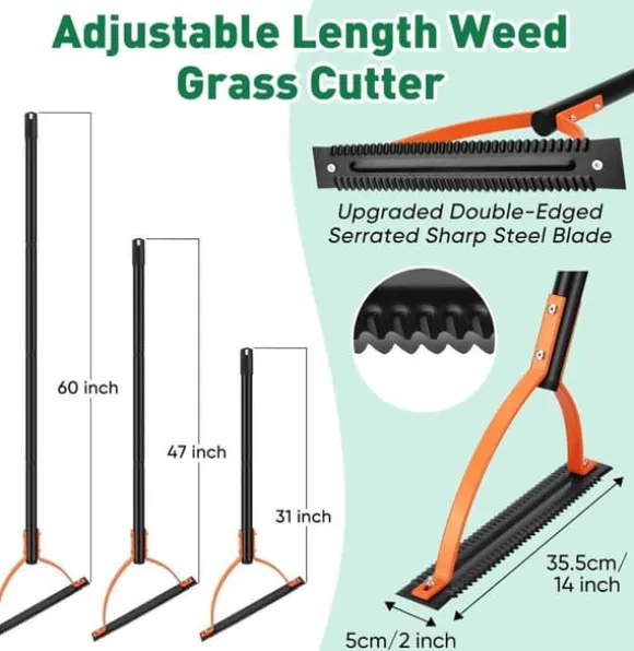 【Robust material】Det långa handtaget är tillverkat av 32 mm tjockt rostfritt stål och vårt handverktyg för ogräsbekämpning är slitstarkt och hållbart. De högkvalitativa, tandade bladen är gjorda av rostfritt stål av hög klass – superskarpa, solida och rostbeständiga – och klarar alla ogräsuppgifter även i regnigt väder. Verktyget är något tungt och kan klippa nästan alla hårda växter och ogräs, men var försiktig med de vassa tandade bladen vid rengöring.