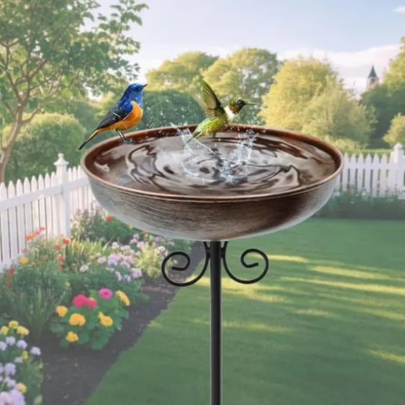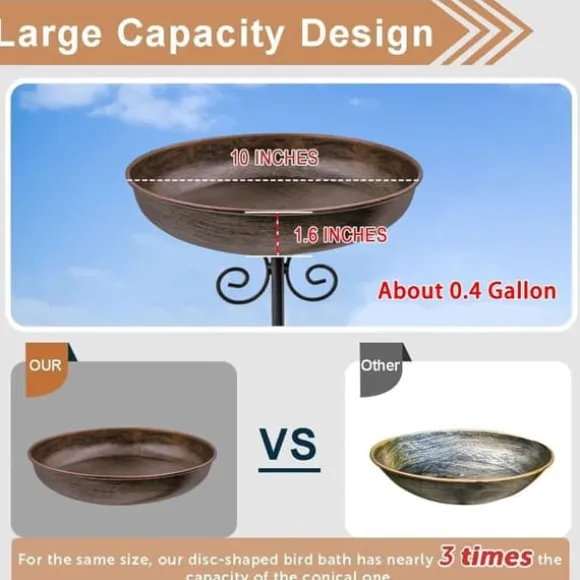 Kompakt men smart design: Vårt fågelbad för trädgården har en skål med en diameter på 25,4 cm och ett djup på 4 cm, och rymmer cirka 1,5 liter vatten. Det 76 cm höga fågelbadet i metall har en tidlös vintage-siluett som blir en inbjudande mittpunkt och lockar fler fåglar till din trädgård.