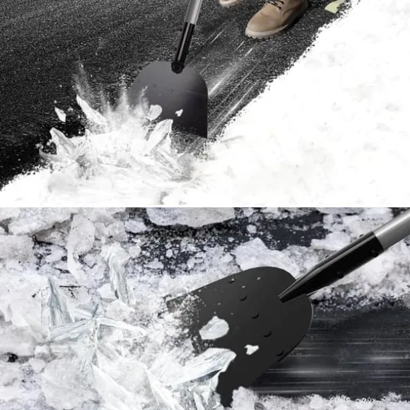 Skyffeln består av tre metallhandtag och en skyffelspade som enkelt monteras och används. Du kan justera höjden efter behov, antingen i tre eller två sektioner. Passar användare i alla åldrar, är lätt att transportera och tar liten plats i bilen. För att förlänga livslängden, använd inte bladet till att bända. -
