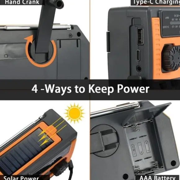 Med flera laddningsalternativ – solpanel (0,1W), handvev, Type-C USB och AAA-batterier (medfölj ej) – kan radion alltid hålla sig igång. Den har en maximal uteffekt på 2W och täcker frekvensområdena AM 520–1710 kHz, FM 87–108 MHz och WB 162,40–162,55 MHz.