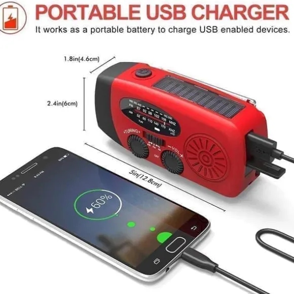 Kraftig vevradio som du ladda via solpanelen, va micro USB-uttaget eller med hjälp av den inbyggda veven. Mobilen kan laddas.