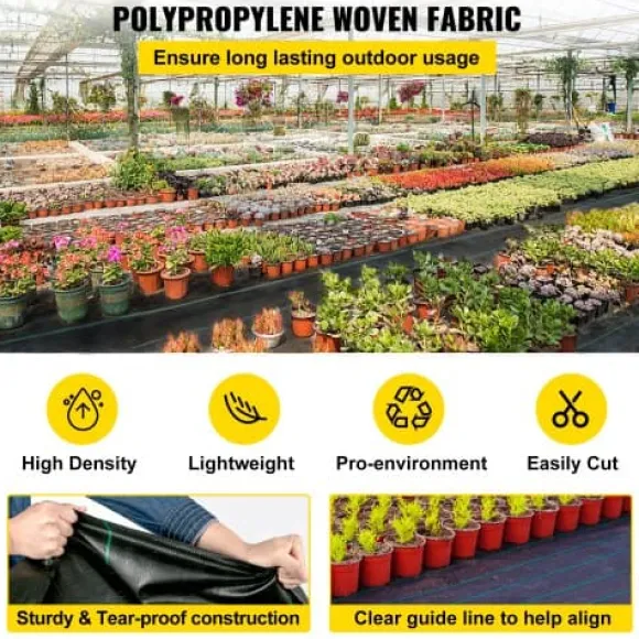 Detta premium ogräsdukstyg erbjuder hållbart och effektivt skydd för din trädgård, rabatter och landskapsprojekt. Dess höga genomsläpplighet gör att vatten och luft kan nå jorden samtidigt som ogrästillväxt förhindras, vilket hjälper till att bibehålla jordens hälsa och minska underhållet. Tyget är lätt att installera och klippa till önskad storlek, vilket gör det lämpligt för en mängd olika utomhusapplikationer.