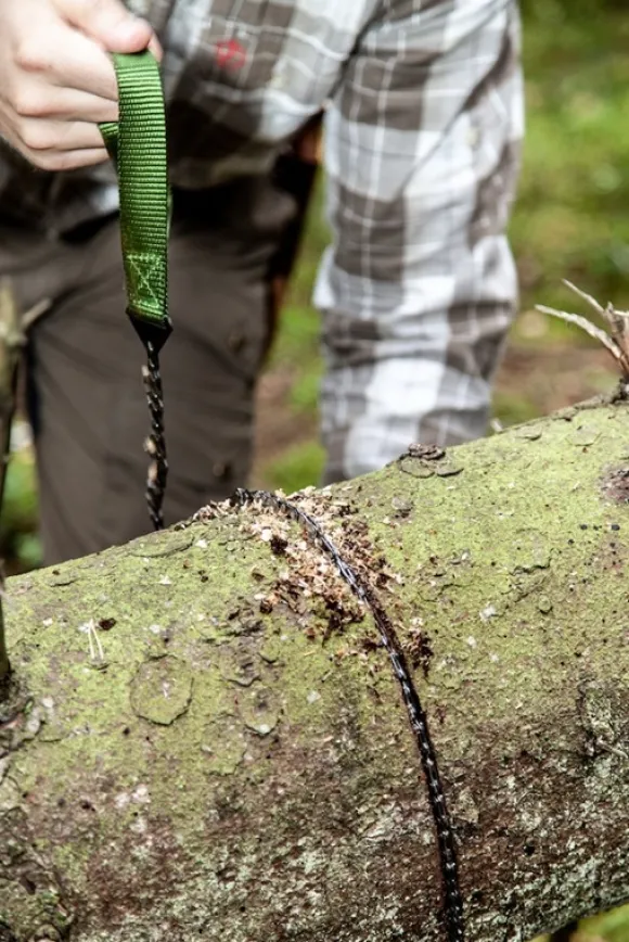 Motorsågskedjan med sina täta tänder kan skäa åt båda hållen och avverkar snabbt och effektivt stockar och mindre träd.
