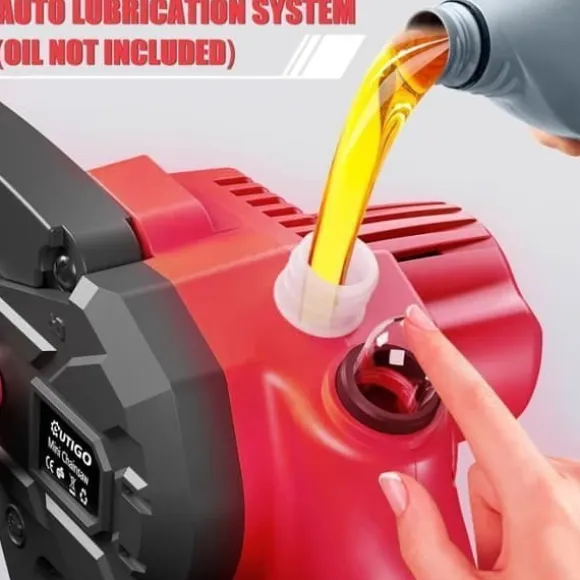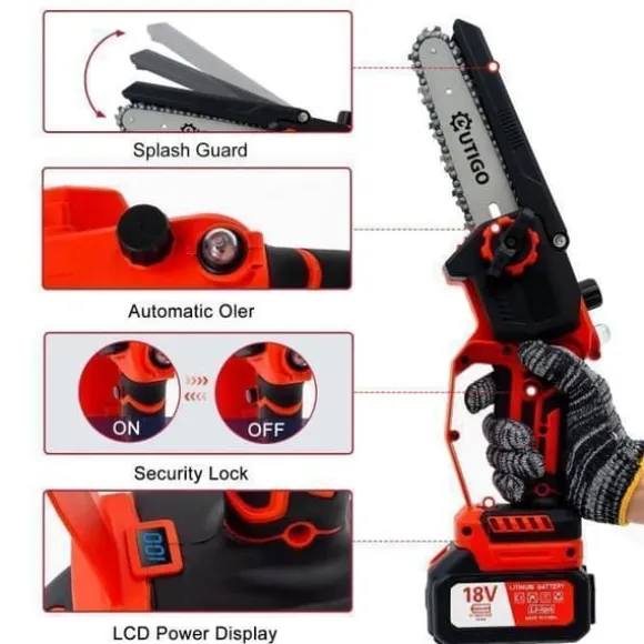 Ingen installation krävs Det du får är en redan installerad motorsåg, du behöver inte slösa tid på att montera den. Den bärbara elektriska motorsågen som bara väger 1,55 kg minskar armtrötthet vid kapning, genom att använda en mycket hård ledkedja, djupt förstärkt för att kapa smidigt. Inte bara enkel enhandsanvändning, utan också säkrare än en tyngre motorsåg. Dess lilla storlek gör att den också kan komma in i smala eller svåråtkomliga områden som större sågar inte kan nå.