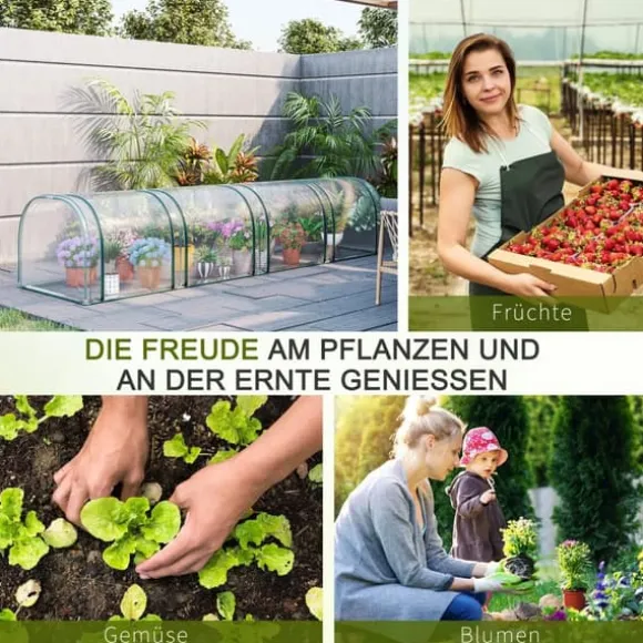 Med detta tunnelväxthus från Outsunny skapar du ett varmt och tryggt hem för dina favoritväxter. Det består av en robust stålram med en hållbar plastduk. Den lätta konstruktionen gör att den enkelt kan flyttas vid behov. Samtidigt ger stålramen hög stabilitet. Slutligen möjliggör sidodörrarna med dragkedja bekväm åtkomst till växterna och gör det samtidigt möjligt att styra ventilationen efter behov.