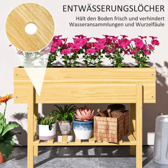 Försköna din trädgård med Outsunny upphöjda planteringslåda! Denna eleganta trädgårdslåda har en stor blomlåda på ovansidan och ett fack undertill för trädgårdsredskap. Med två dräneringshål och ett smart fleecefoder säkerställer denna balkongplanteringslåda ideala jordförhållanden och friska växter.