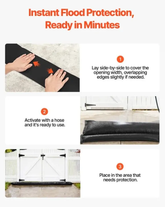 Snabbexpanderande översvämningsbarriär för effektivt hemmaskydd Skydda entréer, garage och källare med en smart vattenbarriär som aktiveras på några minuter. Den sväller snabbt till 76,20–101,6 mm och skapar en stark, tät spärr mot inträngande vatten – utan tunga sandsäckar.