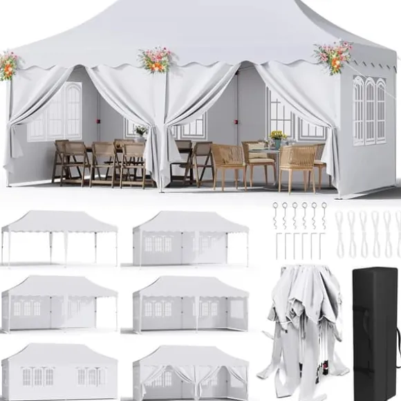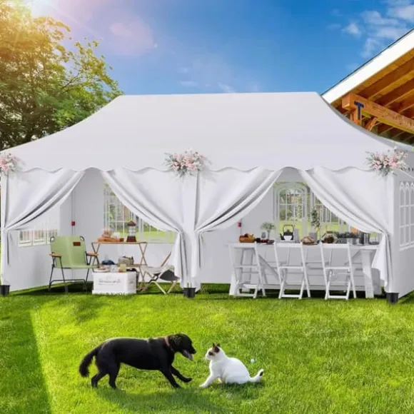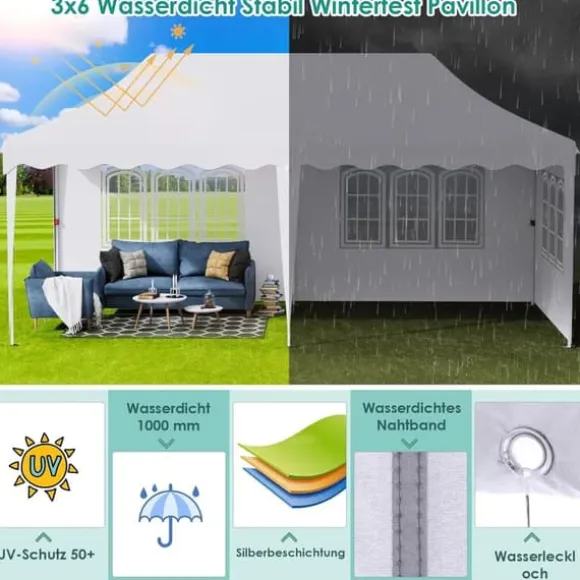 3 x 6 m pop up‑paviljong i vitt – vattentät med sidoväggar och UV 50+Denna vita snabbresande paviljong ger direkt skydd i trädgården, på festen eller marknaden. PU‑belagd HDPE‑duk och en robust ram i aluminiumlegering ger hållbarhet, väderskydd och enkel användning.
